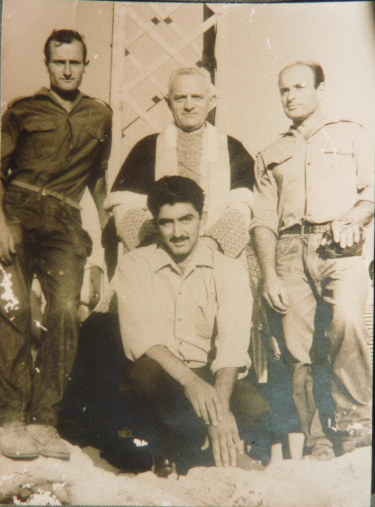les bâtisseurs de la Croix du Castellas en 1964 (de gauche à droite : Pierre Canova, le Père Barberis, Alain Demirdjian, André Canova)