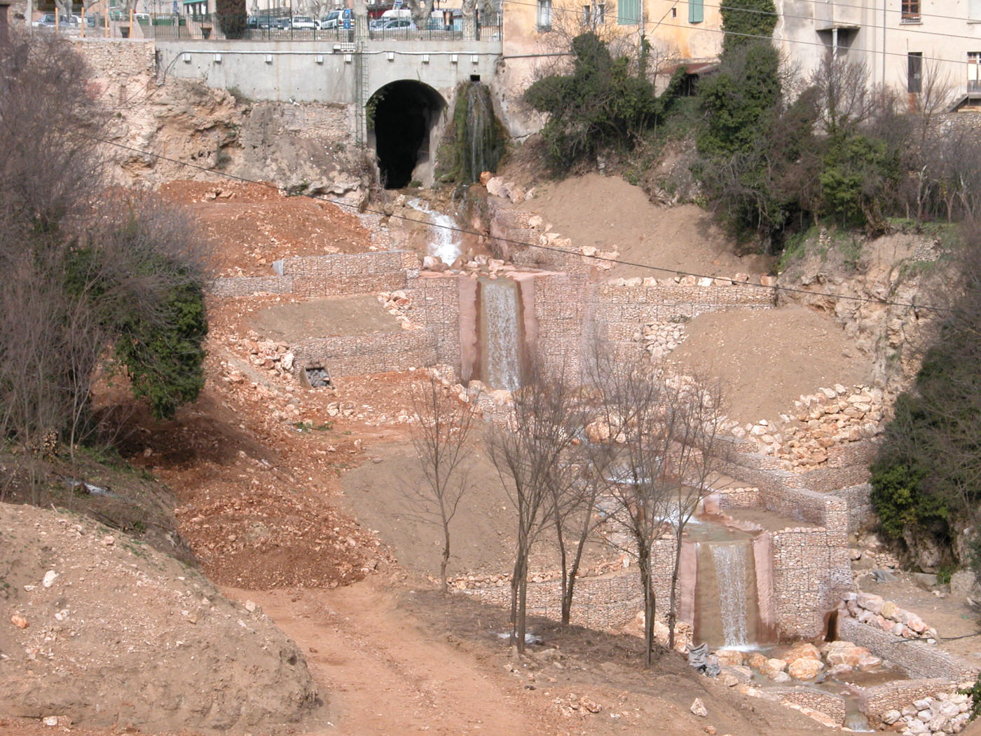 le renforcement de la falaise du Pont d'Or et les cascades de la Fontaine de Roubaud (photo prise le 12 février 2004)