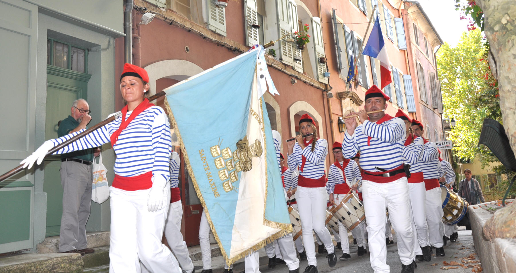 les Fifres et les Tambours de Sainte-Maxime remontant la place de la Mairie