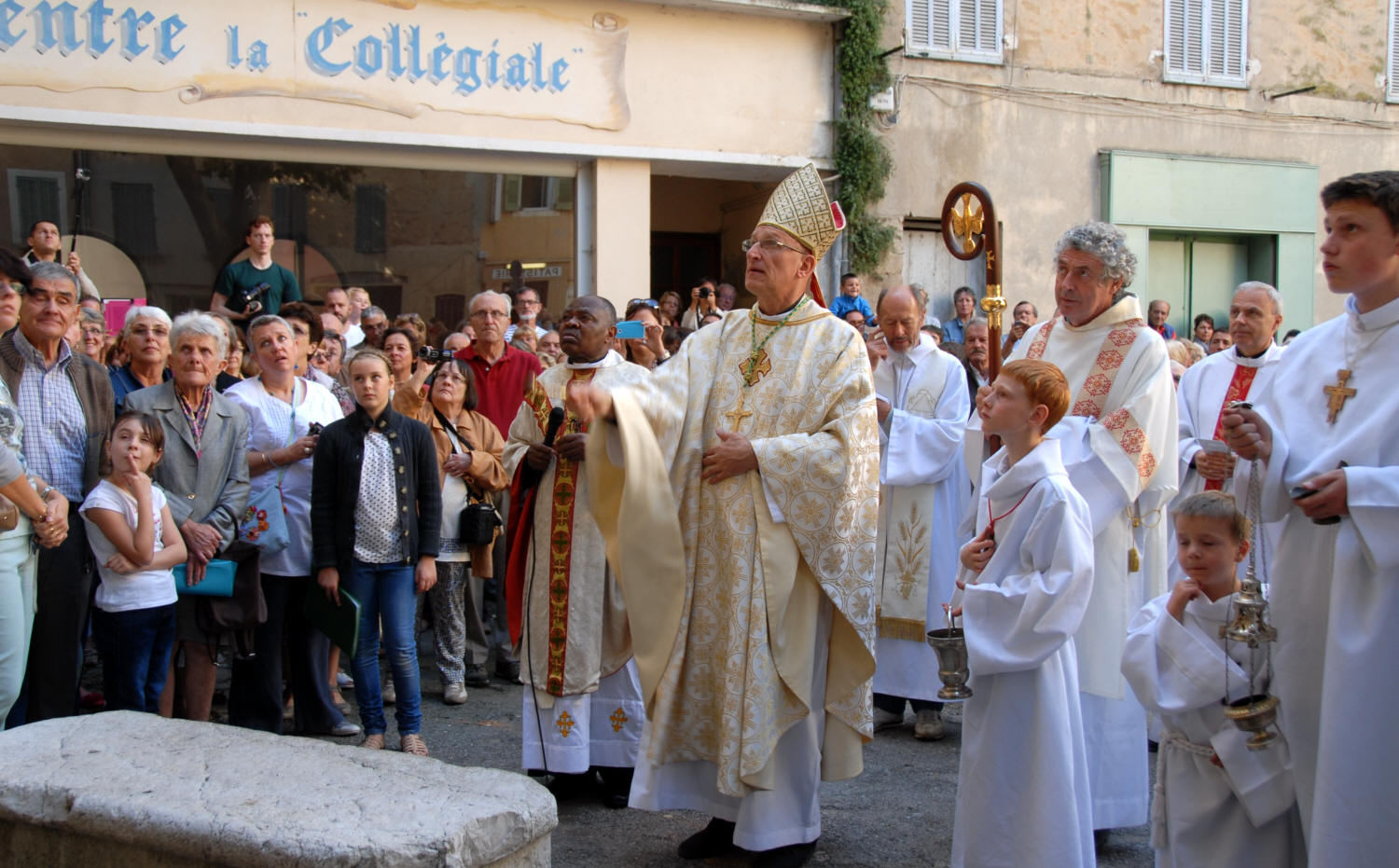 Mgr Rey évêque de Toulon, Ntigulirwa curé de Barjols, O.Deboisgelin diacre au cours de la bénédiction de la plaque commémorative du Millénaire de la Collégiale de Barjols