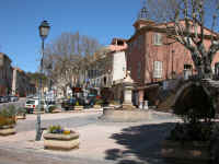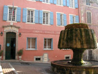 En face de cette fontaine se situe la Mairie qui fut inaugurée le 28 juillet 1833. Sur la porte extérieure de la Mairie vous pouvez observer les Armoiries de Barjols. Plus bas, un remarquable platane était considéré comme l'un des plus beaux du Var. Si sa circonférence est encore à sa base de 11 mètres, il a dû être plusieurs fois taillé et il ne reste plus grand chose de sa magnificence passée...il aurait plus de 300 ans.