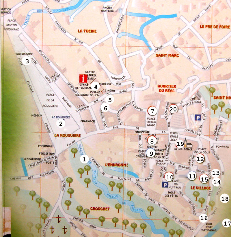 Sites à visiter : 1-les cascades Roubaud 2-La place la Rouguière 3-le monument Bidouré I - l'Office de Tourisme 4 - la maison de l'Eau 5 - la tour du Guet 6-le portail des fainéants 7- monument aux Morts 8-place du Cpt Vincens 9-la mairie (maj : 21/05/2008) 10-le moulin à huile (24/05/2008 11-la Prévôté (maj : 21/05/2008) 12-la place de la Fontaine de la Cour 13-porte des Augustins (maj : 25/05/2008) 14-le Cloître (maj : 27/05/2008) 15-porte de la demeure du Marquis de Pontevès (maj : 25/05/2008) 16-la porte des Externes 17-le Fauvery (maj : 11/10/2013) 18-le coin des Artistes (maj : 25/05/2008) 19-la Collégiale (maj:29/05/2008) 20-le Réal (30/05/2008) et