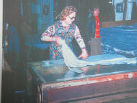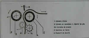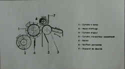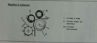 III - le corroyage : les peaux des bovins tannées sont très hétérogènes et épaisses. Il faudra donc non seulement les égaliser, mais également les refendre. La peau sera ainsi dédoublée en deux partie : la fleur et la croûte. Dans le tableau synoptique 2, nous voyons les différentes opérations de corroyage propres à ces deux parties de la peau. En revanche, dans cet exposé, nous ne développerons que la fabrication concernant le traitement de la fleur. 7 - l'essorage : cette opération se réalise sur des machines à cylindres de feutre. Elle est destinée à éliminer mécaniquement une forte proportion d'eau du cuir (cliquez sur le croquis) 8 - le refendage : cette opération a pour but d'égaliser le cuir en épaisseur en le séparant en deux feuilles, l'une portant le côté fleur d'épaisseur uniforme, l'autre le côté chair appelé "croûte". (cliquez sur les photos 9 - le dérayage : comme le refendage, il permet d'égaliser le cuir en épaisseur, mais avec plus de précision. L'excès de cuir est éliminé à l'état de copeaux appelés "dérayures", qui constitue un déchet. (cliquez sur le croquis) 10 - la neutralisation : travail qui consiste à éliminer l'acidité de la peau pour la préparer pour les opérations suivantes : 11 - le retannage : opération chimique qui a pour but de donner au cuir fini sa main, son plein, en garnissant de préférence les parties spongieuses de la peau. Cette phase contribue pour une grande part dans la qualité du cuir fini. 12 - la teinture : coloration de la peau plus ou moins en profondeur. 13 - la nourriture : elle consiste à faire absorber au cuir des quantités variables de matières grasses dans le but, soit de donner de la souplesse au cuir, soit de lui conférer une certaine imperméabilité, soit les deux. 14 - l'essorage / 15 - la mise au vent : (voir tannage végétal) 16 - la sèche : le cuir est gorgé d'eau, il faut le sécher pour le rendre utilisable. Plusieurs méthodes peuvent être utilisées, soit en suspendant le cuir dans un séchoir ou un tunnel, soit en le collant sur une glace et en utilisant un tunnel, soit en le séchant sous vide. Dans ces deux cas, la sèche est réalisée en plaquant la peau sur une surface plane, ce qui a pour effet de la fixer dans cet état. 17 - la mise en humeur : à la sortie de la sèche, la peau est ferme. Il convient de l'assouplir en l'humidifiant. Ceci est effectué en mettant les peaux dans de la sciure humide. 18 - le palisson : ce travail consiste à étirer fortement le cuir dans toutes les directions afin de séparer les fibres les unes des autres et donner ainsi de la souplesse au cuir. 19 - la sèche : les cuirs sont séchés et tendus de façon à les étirer au maximun et à les rendre plein. Ceci se réalise soit sur la sèche sous vide, soit en cadrant la peau. séchoir sous vide 20 - le ponçage : cette opération se pratique sur fleur ou sur chair, pour modifier l'aspect des surfaces. Dans le cas des ponçages sur fleur, il y a élimination des défauts superficiels, mais détérioration du grain naturel de la peau qui fait le charme du cuir. Machine à blanchir et dispositif de dépoussièrage