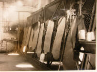 10 - la mise au vent : à la sortie du retannage, le cuir est humide. Cette opération consiste à sécher, à étirer et à aplanir le cuir. La peau devient plane, lisse et acquiert un certain brillant.(cliquez sur les photos) 11 - la demie sèche : opération délicate, qu'il faut conduire lentement, afin d'éviter que le cuir ne soit séché trop rapidement et qu'il soit coloré et fragilisé par des remontées de tanins non fixés sur la fleur. Elle dure entre 3 et 7 jours pour amener le cuir à 30-35% d'humidité pour que la peau puisse subir une 2èm mise au vent. 12 - le retenage : la peau est de nouveau légèrement gondolée. Cette 2ème mise au vent lui rend son aspect lisse et brillant 13 - la sèche : il s'agit d'amener le cuir à environ 16-18% d'humidité, ceci pour réaliser la dernière opération (cliquez sur la photo) séchoir sur glaces