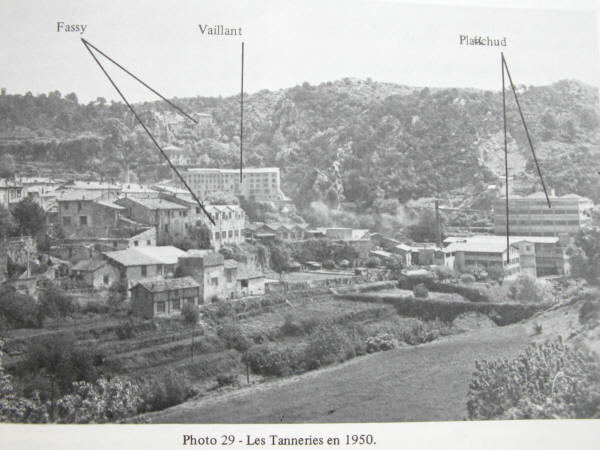 chimiques et grossistes pour les produits accessoires. vue générale sur les tanneries .Cinq tanneries restèrent en activité en 1918. La tannerie PAYAN et FABRE, faute de successeurs, s'arrêta en 1920. Eugène PAYAN, sans héritiers, légua ses biens à la mairie en 1938. En remerciement, une place et une rue de Barjols portent son nom. La tannerie CARLE ferma en 1928. Pendant ce temps, les trois tanneries restantes Paul VAILLANT et fils, Albert PLAUCHAUD et fils, et FASSY voyaient leur effectif dépasser chacune la centaine de salariés, pour représenter en 1939 un total de 450 personnes environ. vue générale sur les tanneries .Après la guerre 1939-1945, au fur et à mesure de leur croissance,