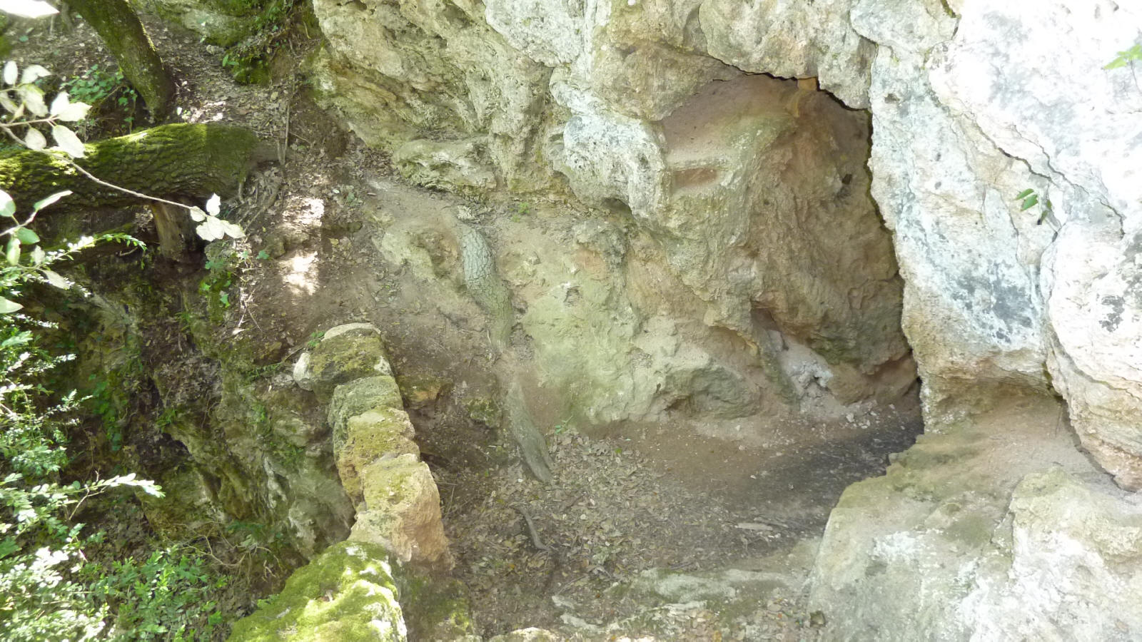 l'entrée de la Grotte de l'Ermitage (la porte en fer forgé a disparu - aucune protection contre le vandalisme) - Vallon des Carmes à Barjols