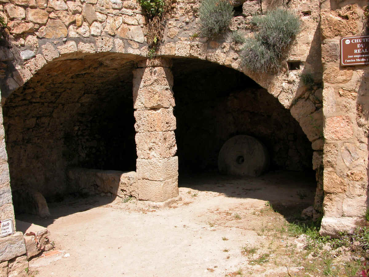 page précédente les deux voûtes(9) du niveau inférieur du quartier du Réal - la meule du moulin posée contre le mur du fond